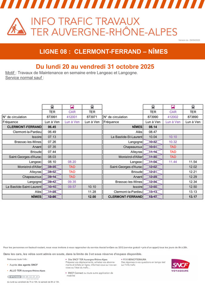 Correspondance à Clermont-Ferrand de et vers Paris. Correspondance à Nimes de et vers le littoral (Marseille, Montpellier, ...).